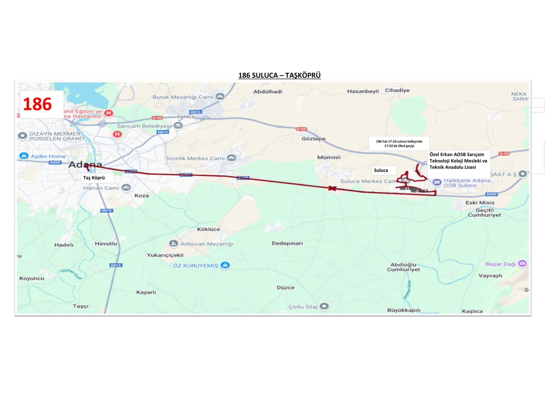186 Numaralı Belediye Otobüsünün güzergah ve saat bilgileri aşağıda yer almaktadır.